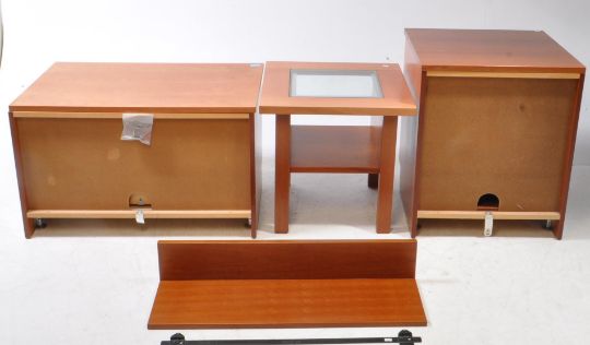 Beaver and Tapley - A vintage mid 20th century Beaver and Tapley teak modular storage system unit. The system to include a low chest of drawers, alongside another taller example. Featuring a floating wall mounted shelf, and a small coffee side table of square form with inset glass top.