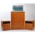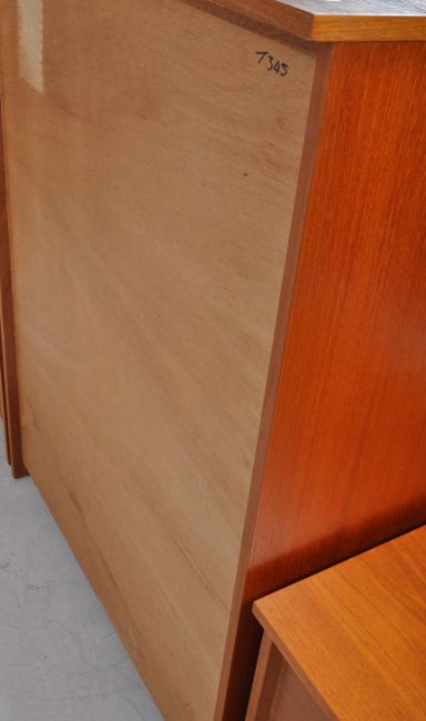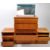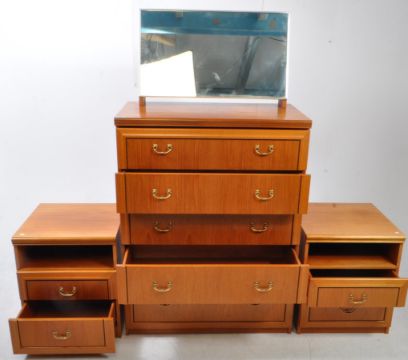 A vintage mid 20th century teak pedestal chest of drawers, alongside matching bedsides and mirror. The chest of drawers raised on a plinth base, having a bank of five drawers to front, each with metal swing handles to front. The bedsides each featuring two drawers below a pigeon hole shelf. Measures approx: 108x83x49cm