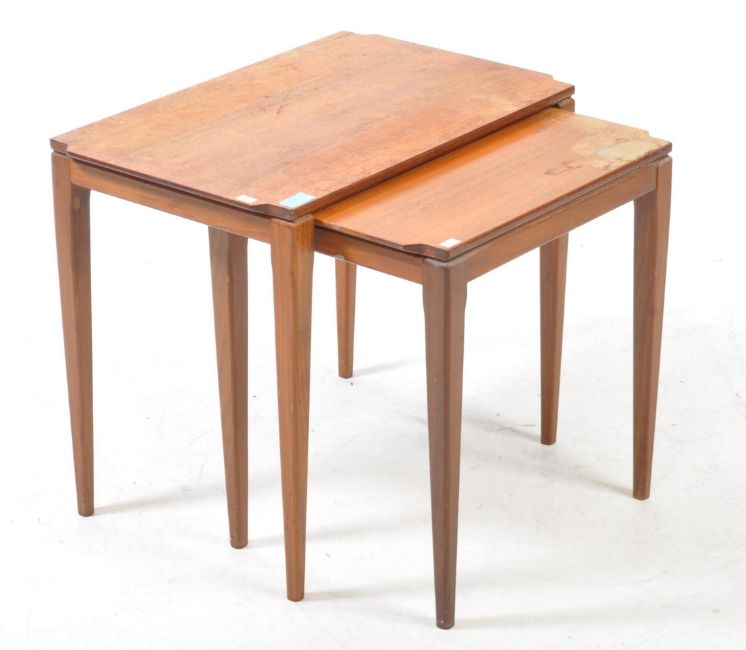 Richard Hornby - Fyne Ladye - A vintage mid 20th century teak nest of tables. The nest consisting of two tables, each of graduating form. The tables raised on tapered legs. Measures approx: 50x55x35cm