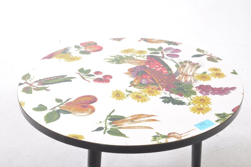 British Modern Design - A mid 20th century circa 1950s circular floral top coffee / occasional table. On dansette ebonised tapering legs with a basket of flowers and other floral designs to top. Measures approx: 50x55x55cm