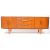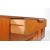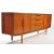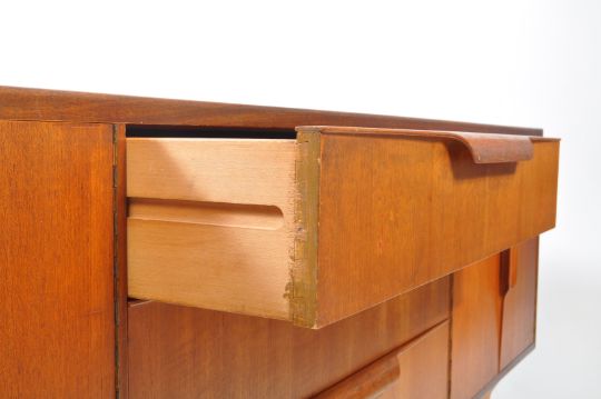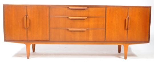Austinesuite - Mid century teak sideboard credenza. Long rectangular form with bank of three drawers to centre flanked by twin cabinet doors wth a shelved interior. Tapering on stumped tapering legs with lipped pull handles. Measures approx: 75x200x45cm