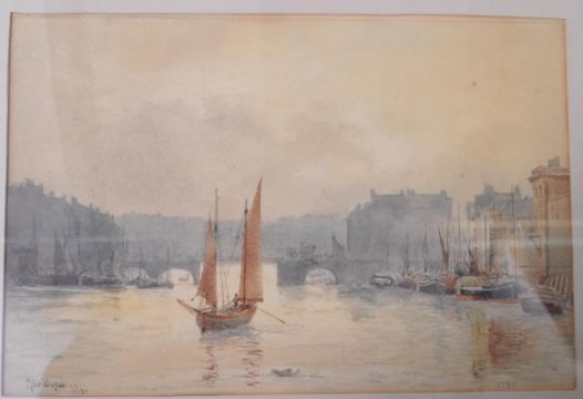 Hubert James Medlycott (1841-1920) - Two late 19th century watercolour paintings. Waterside scenes featuring sail boats and yahcts. London & Itby. Frame and glazed. 41cm x 55cm(frame) 17cm x 26cm approx artwork.