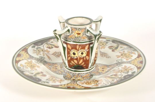 Gouda Zuid Holland glazed pottery wall plate with integrated central vase pot. Early 20th century circa 1920s majolica earthenware, cream ground with bird / floral patterns. Makers mark to underside, number 84.