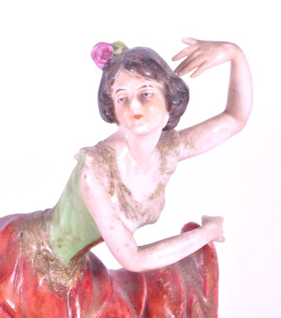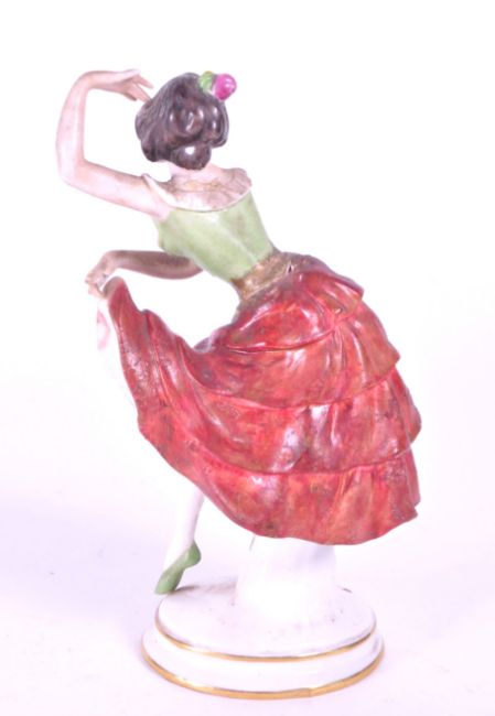 Aelteste Volkstedt - Mid century German porcelain salsa dancer figure, raised on an oval plinth style base. Makers mark to the underside and numbered 13588. Measuring approx. 14cm tall. Sold AF.