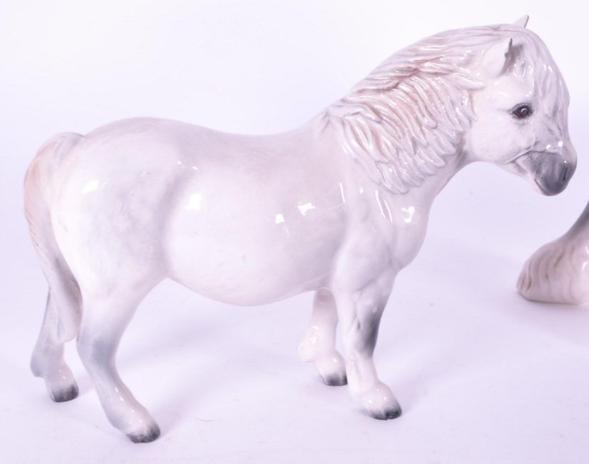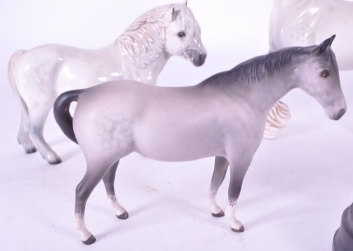 Beswick / Royal Doulton - A collection of porcelain china horse figurines / statues. Including a grey Shetland Royal Doulton pony, cantering shire horse 975, dapple grey horse and another dapple grey, AF. Together with a springtime horse on plinth stand.