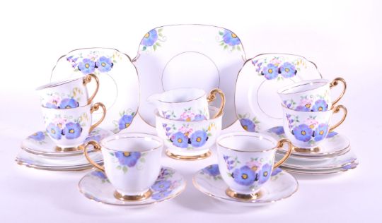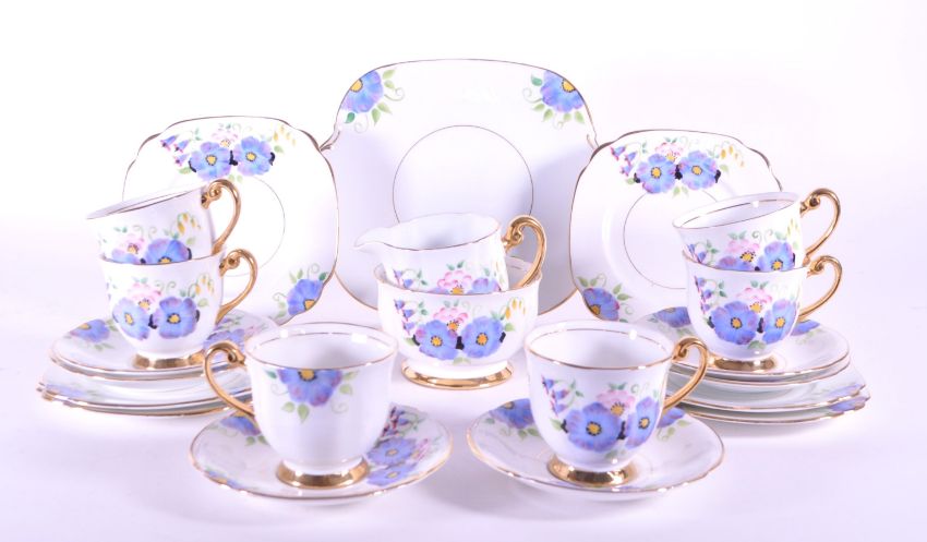 A vintage 20th century blue floral pattern porcelain china tea service set for six. To include cups, saucers, sugar bowl, milk jug, cake plates (trios) serving plate. Unmarked