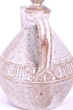 Eric Golding for Branscombe Pottery - A vintage 20th century studio art pottery teapot in earthenware tones with banded detailing. Shaped spout and handle. Impressed maker's marks below the handle. Measures approx. 23cm x 21cm.
