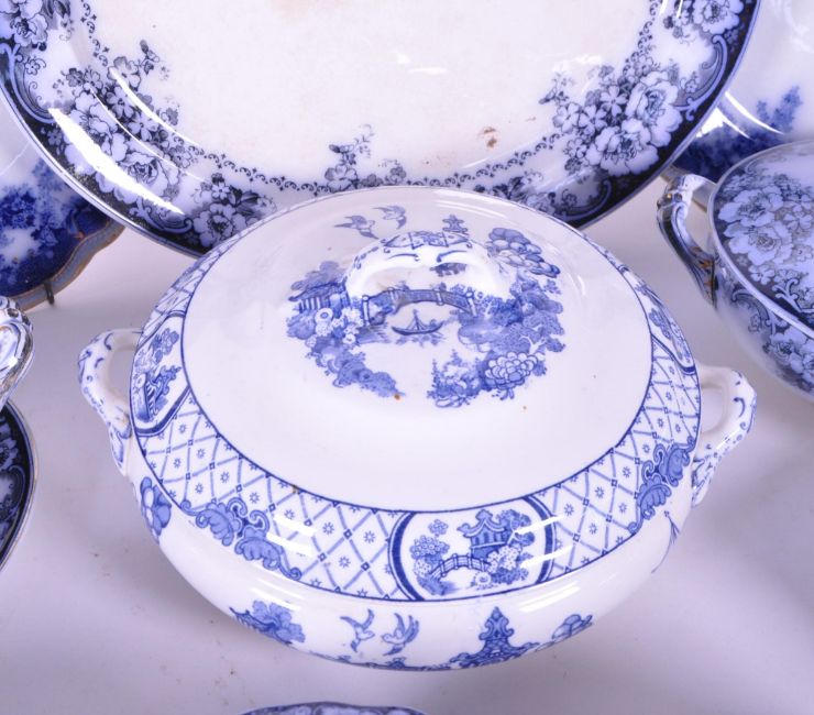 Alfred Meakin Ltd - Early 20th century semi porcelain blue and white transfer design pieces, including plates, lidded twin handled tureens, and serving plates. Comprised of Alfred Meakin Ltd 'Normandy' pattern examples, and S.H & Sons 'Welbeck' opaque china examples. Makers marks printed to the underside of each piece.