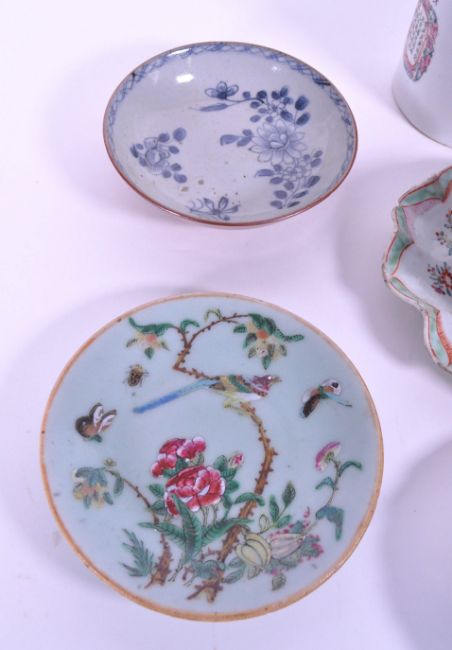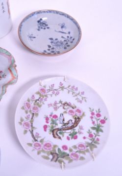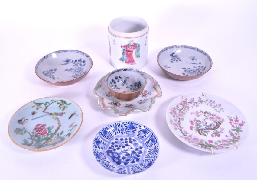 A collection of early 20th century and later Chinese porcelain display wall plates & bowls. Including blue and white examples, hand painted famille rose with character mark, with a figural pot without lid and a flower form plate. Sold AF. Largest measuring approx. 10cm x 9.5cm.