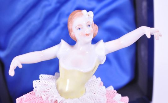 Unterweißbacher Werkstätten für Porzellankunst GmbH - Late 20th century German porcelain ballerina dancer figure with pink and white lace work skirt encrusted with flowers. Numbered 8765 to the underside of the piece. Housed within the original box. Makers mark to the underside of the piece. Measuring approx. 14.5cm tall without box.