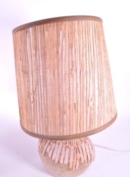 Two late 20th century pottery lamp bases with shades. Comprised of a pottery lamp base decorated with relief frogs and lily pads, and another circular shaped lamp base with rustic shapes / textures and a cream and brown colourway. Largest measuring approx. 45cm tall.