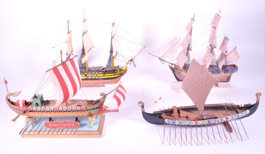 Collection of late 20th century scratch built warships / boats / yachts sailing boats. Including Roman warship, Viking ship, Revell Battle of Trafalgar and HMS bounty. Some on plinth base.
