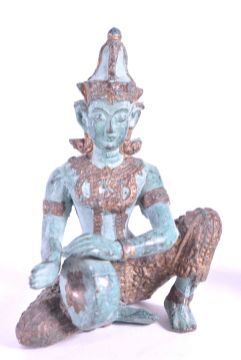 Two 20th century bronze Thai Buddha temple figures. In traditional clothing with one playing drum the other in prayer.
