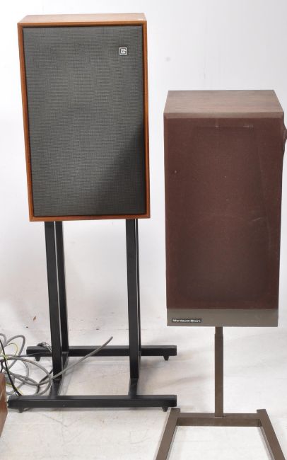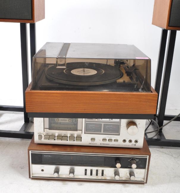 A collection of vintage mid 20th century Hi-Fi equipment. The collection to include a BSR McDonald MP60 turntable, a Pioneer CT-F500 Stereo Cassette Tape Deck, a Rotel Amplifier, and two pairs of speakers with stands.
