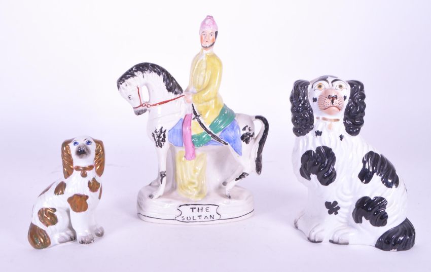 A collection of three 19th century Staffordshire ceramic figures. The collection to include two spaniel dog figures, alongside a figure of a man seated on horseback with the text ' The Sultan ' to lower.