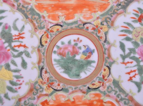 19th century Chinese Canton wall charger porcelain china display plate. Hand painted body with quarter panelled design depicting wild birds / flowers and Chinese figures. Polychrome with repeating pattern border in a cream ground.