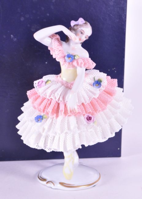Aelteste Volkstedt - Mid century German porcelain dancing lady figurine no. V20003. Decorated with a pink and white lace dress encrusted with delicate hand painted relief flowers. Makers mark and number stamped to the underside of the figure. Housed within the original box. Measuring approx. 14.5cm tall.