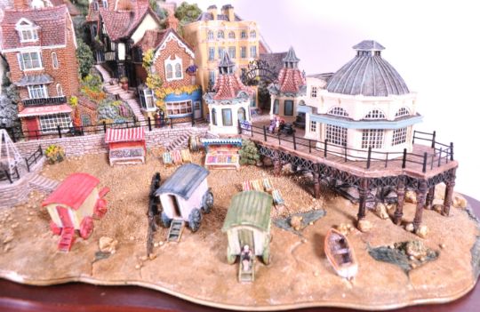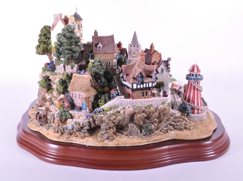 Lilliput Lane - 2000 'Beside The Seaside' L2320 limited edition large figurine no. 0588 out of 2000. Accompanied by the original wooden plinth base. Housed within the original box with deeds and duplicate certificate of authenticity. Excellent condition apart from the sailboat which is loose and may need reseating.