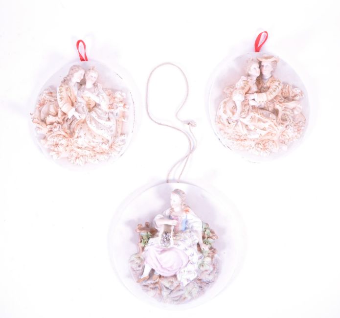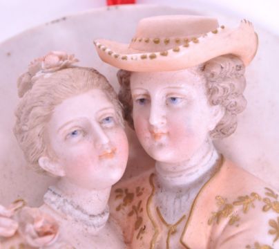 Collection of three late 19th century continental bisque porcelain round wall plaques, each decorated with hand painted relief figures, two of which include courting couples. Makers unknown. Largest measuring approx. 19.5cm x 19.5cm.