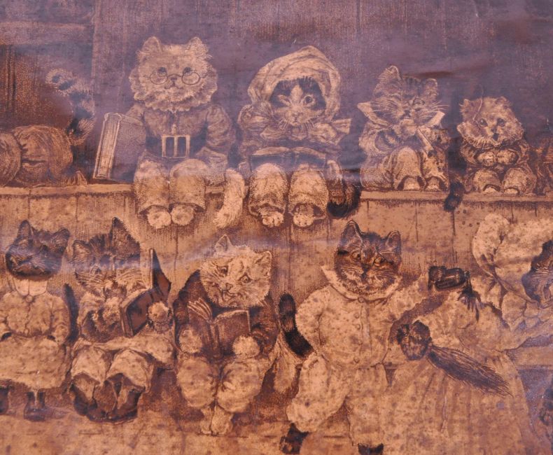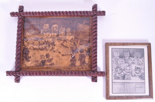 After Louis Wain - Late 19th century Mr's Tabby's Academy monochrome print, published by Cassell & Co for their 1888 Christmas Annual Yule Tide. Print depicts an illustration from Louis Wain's "Mrs. Tabitha's Cats' Academy"series of whimsical and anthropomorphic cat illustrations. Alongside a print of 'At The Pantomime' by Louis Wain, framed and glazed. Largest housed withina carved wooden frame measuring approx. 31cm x 38cm.