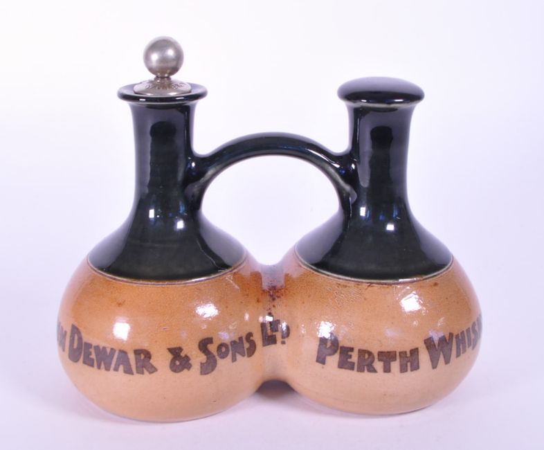 Doulton Lambeth, England - Early 20th century stoneware whisky double spout jug / decanter. Having a green top with a double body with flat bottom. Text on side reading John Deward & Sons Ltd, Perth Whisky.