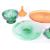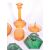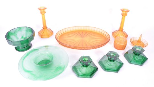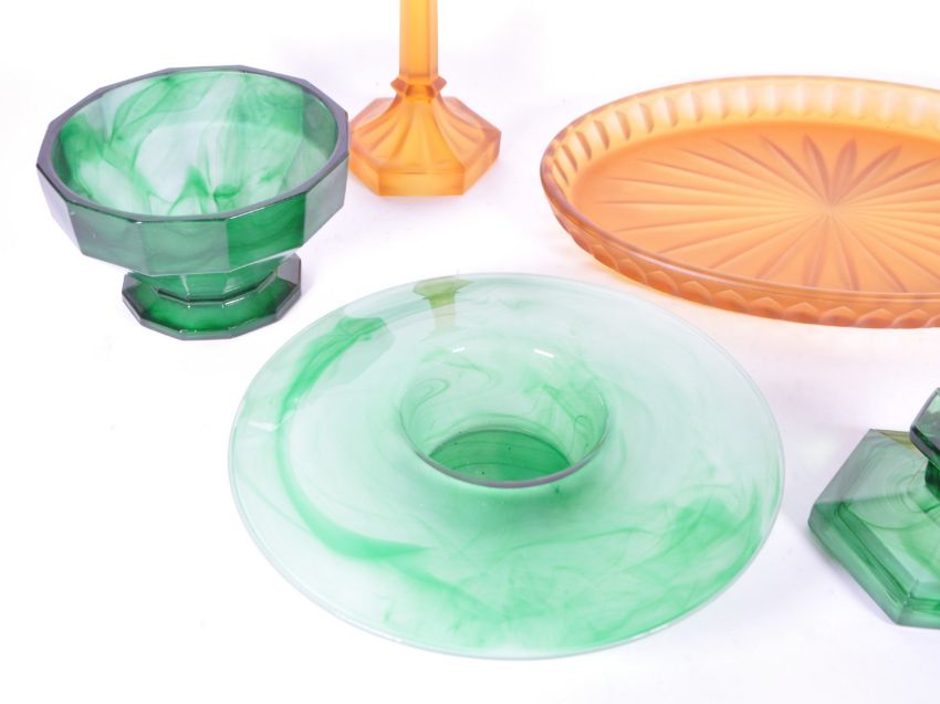 Collection of early to mid century art deco amber and green glass ware, believed to be green cloud by Davidson and frosted amber glass by Libochovice. Comprised of a part vanity set, including lidded pot, trinket tray and candlestick holders, bowl, vase and more candlestick holders. Trinket tray measuring approx. 32cm x 22.5cm.