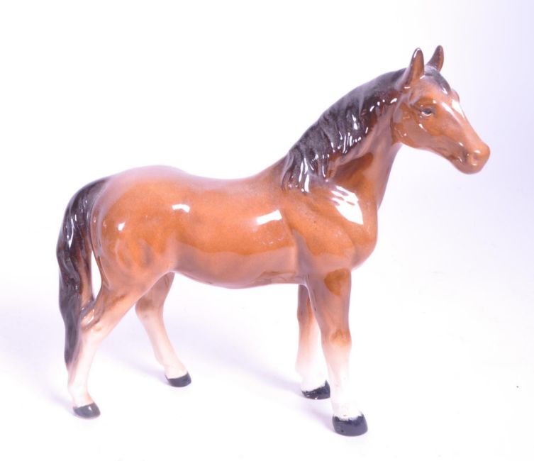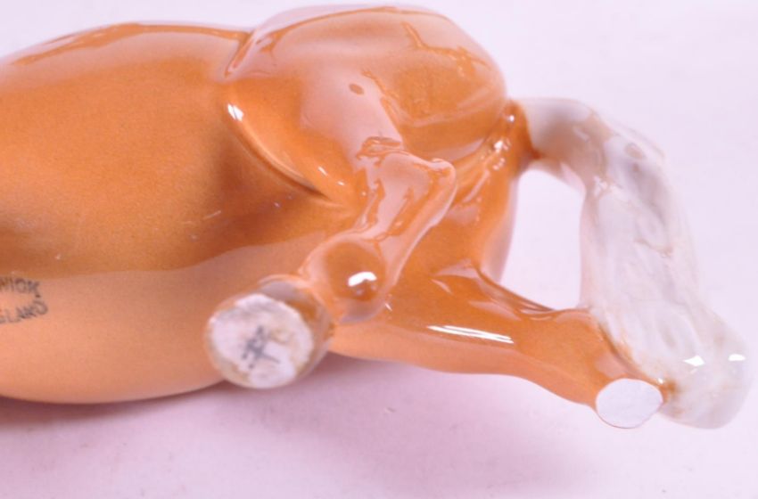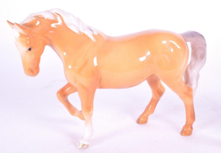Beswick - A collection of four porcelain china horse figurine / statues. To include a palomino, prancing arab stallion and a head up palomino horse. AF. Maker's stamps to underside.