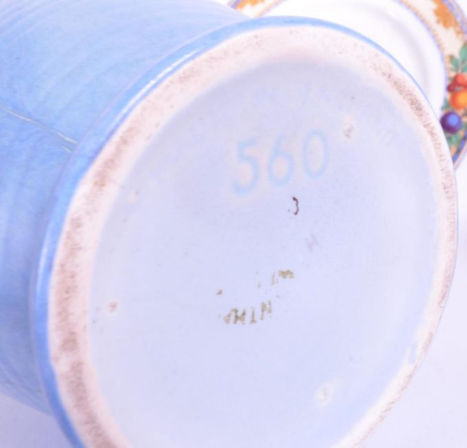 A mid century Scotch Ivory part tea set with six plates & saucers, five cups, sugar bowl and cream jug (AF) by B.P.Co.Ltd, made in Great Britain along with an early 20th century Crown Devon Fieldings art vase, numbered 560 to the underside. Largest piece measuring approx. 25.5cm tall.
