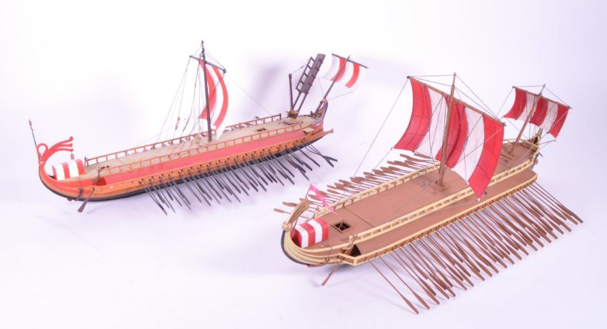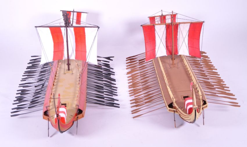 Two late 20th century scratch built sailing Greek / Roman trireme warship. Having multiple oars with sails to bow and mid ship, in red and white colourway.