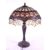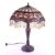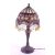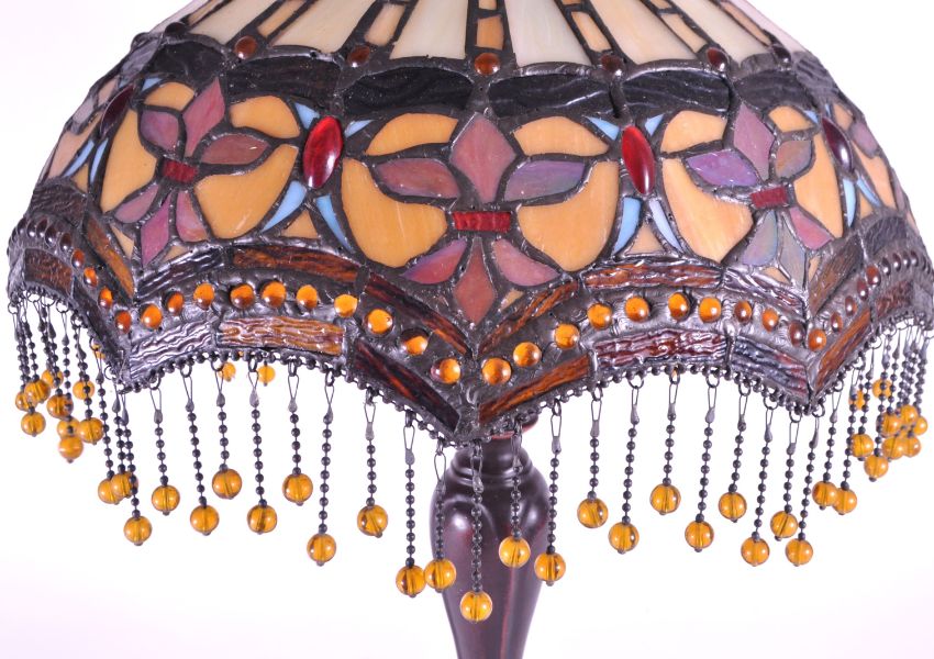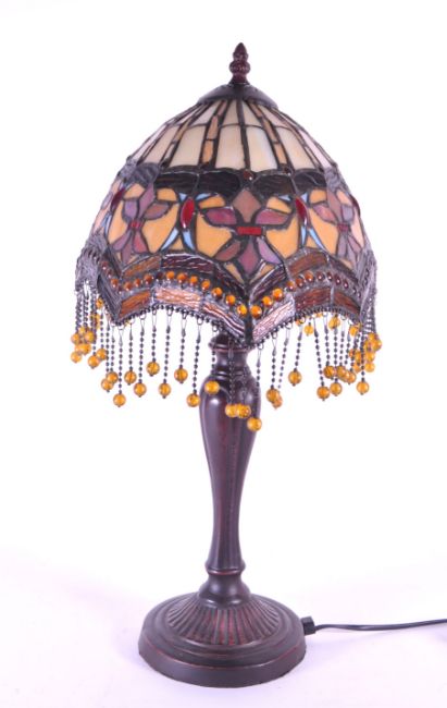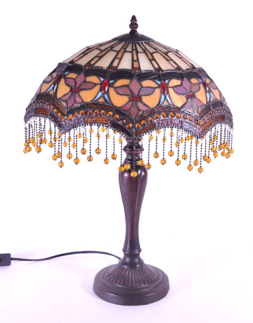 A 20th century Tiffany style table lamp. The lamp featuring a plinth style base with fluted gadrooned central column. Having an oval polychrome leaded glass shade, with cabochons and beaded tassels. Finial to top. Measuring approx. 53cm tall.