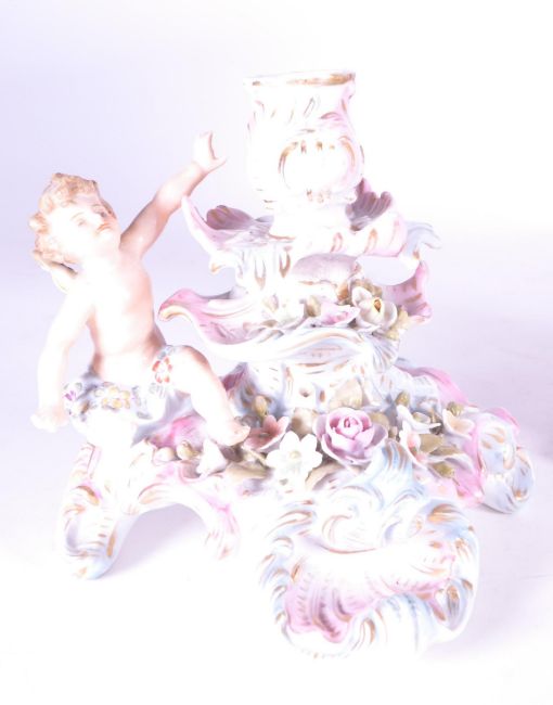 A collection of early 20th Century German bisque porcelain pottery comprising x2 candle sticks and x1 compote, each decorated with cherubs and flowers. The compote stamped with a blue Dresden style maker mark to the base. Largest measures approx 20cm tall.