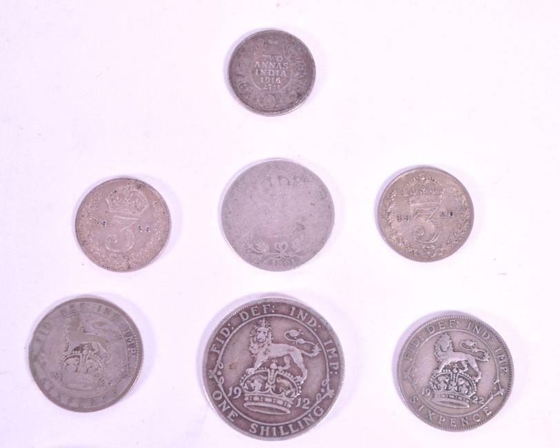 Collection of 20th century silver and half silver coins, examples including a 1918 George V half crown, 1914 George V one florin, 1912 George V one shilling, 1916 George V two annas, 1920 George V three pence, and more. Full silver coins weighing approx. 44.9g. Half silver coins weighing approx. 34.5g.