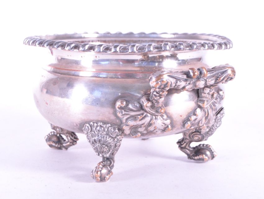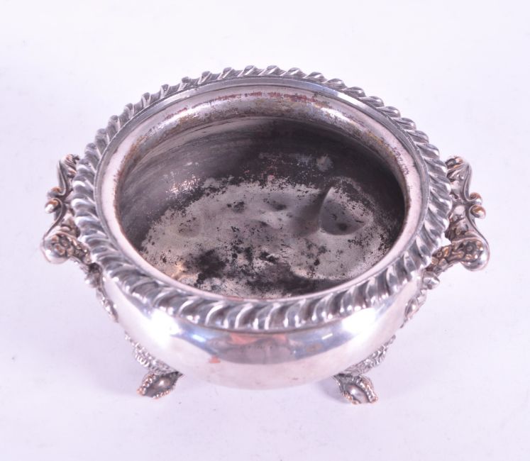 A vintage 20th century silver plate English censer bowl. Fanned rim with vine foliate Art Noveau style handles raised on ball and claw feet.