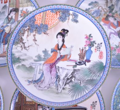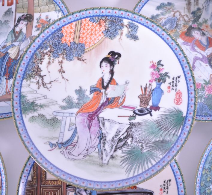 A collection of late 20th century imperial Jingdezhen Chinese porcelain wall display plates. Polychrome design with Chinese figures and decorated borders. Chinese symbols to verso with retail posting boxes. Made in the People's republic of China. Twelve in total.