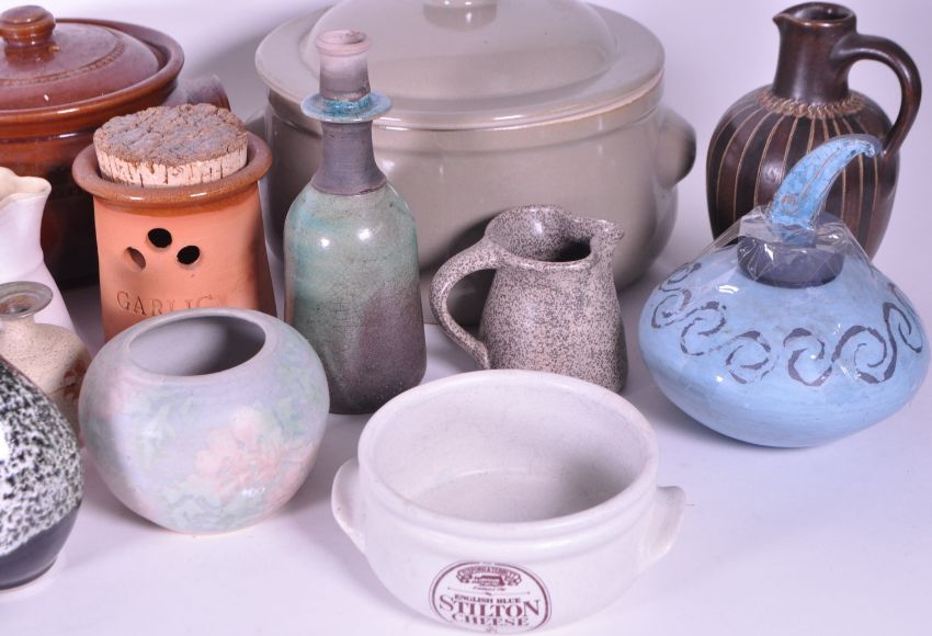 Large collection of late 20th century branded and studio pottery / kitchen wares. Including lidded serving dishes, vases, jugs, pestle and mortar, pots and more. Makers including Holkham Pottery, Tuxford and Tebbutt, and many other studio pottery artists.