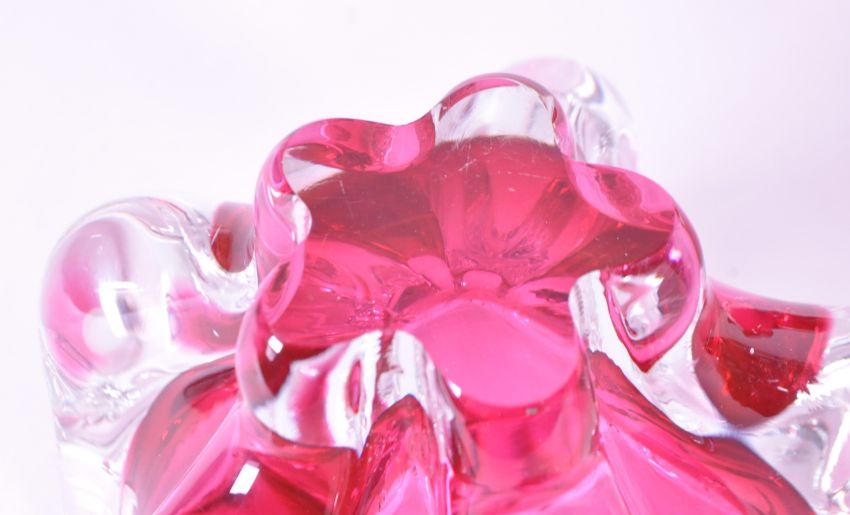 Three late 20th century bohemian Czech cranberry glass bowls in the manner of Josef Hodspodka. Featuring cranberry coloured fluid shaped bowls and clear glass tapering bases. No makers marks to the undersides. Largest measuring approx. 11.5cm x 18cm.