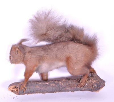 Taxidermy / Natural History - A vintage 20th century taxidermy red tree squirrel (Sciurus vulgaris). Standing on a naturalistic branch.
