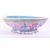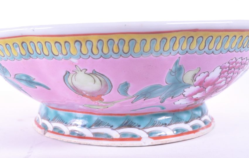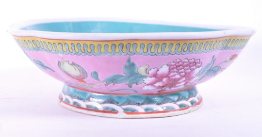 Vintage 20th century Chinese Famille rose pottery footed dish decorated with an inner blue glaze and a more ornate pink, yellow and green floral design to the exterior. Octagonal curved shaped bowl and raised on a circular footed base. Stamped CHINA to the underside. Measuring approx. 8cm x 25cm.