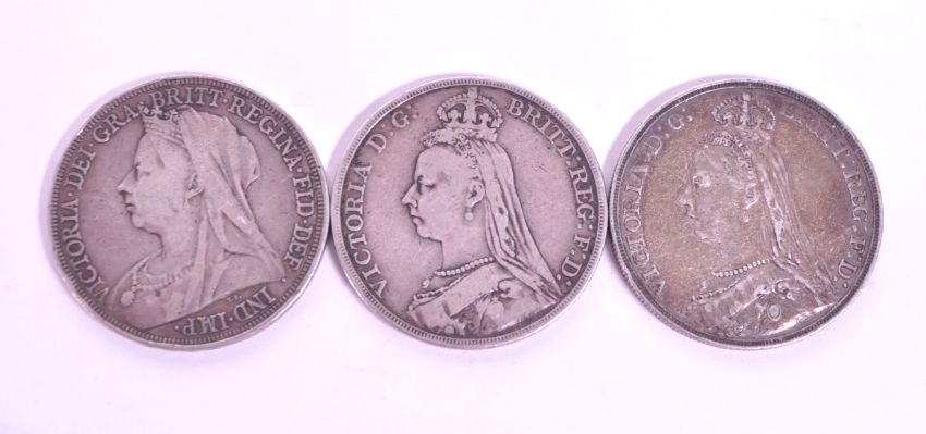 A collection of three late 19th century 1890s Queen Victoria circulated silver currency Crown coins. The collection to include two 1890 examples (weighing approx 27.83g & 28.11g respectively), a 1895 example (weighing approx. 27.92g).