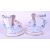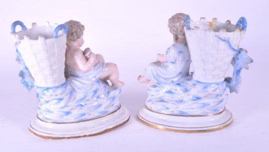 Wallendorf - Two German early 19th century porcelain vases / figures in a blue and white colourway. Both feature a cherub figure leaning against a cornucopia encrusted with hand painted flowers raised on an oval base with gilt detailing. Makers marks to the underside of each piece. Sold AF.