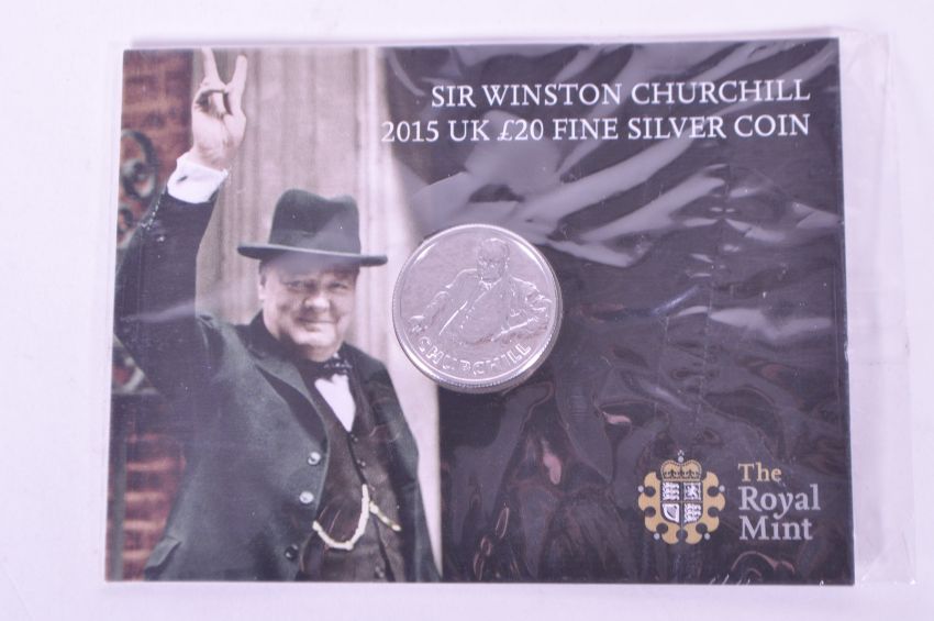 Three late 20th / 21st century commemorative proof coins, comprised of a 2015 Royal Mint proof Sir Winston Churchill £20 fine silver coin to commemorate the 50th anniversary of his death, a Royal Mint 1989 £2 proof coin to commemorate the visit to the Bailiwick by Her Majesty Queen Elizabeth II, and a 1990 £2 proof coin as Loyal Greetings to Her Majesty Queen Elizabeth II from Bailiwick of Jersey.