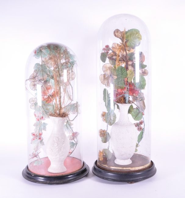 Two late 19th century French globe de mariée wedding glass domes containing bisque porcelain vases with wire and straw flower bouquets. Raised on circular wooden plinth bases. Largest measuring approx. 52.5cm tall.