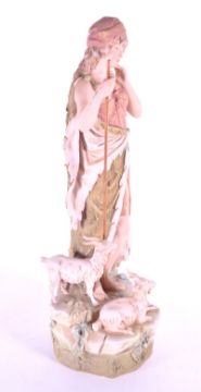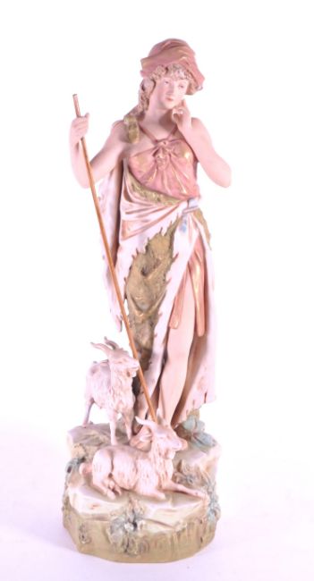 Royal Dux Bohemia - Early 20th century Czechoslovakia bisque porcelain Sheperdess figure in a green and pink colourway. Featured holding a wooden staff next to two goats and raised on a rock circular shaped base. Makers marks printed to the underside of the figure. Measuring approx. 38cm x 12.5cm.