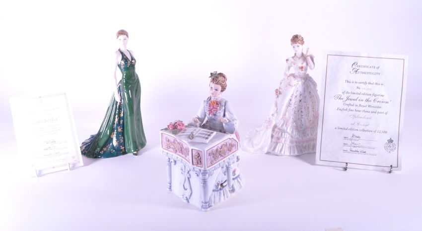 Three late 20th / 21st century porcelain lady figurines. Comprised of Coalport Figurine of the Year 2003 Samantha, Royal Worcester 1996 The Jewel in the Crown limited edition no. 10,392 out of 12,500 and Lefton 1997 Beethoven's Symphony figure. Two with certificates present. Largest measuring approx. 23cm tall.