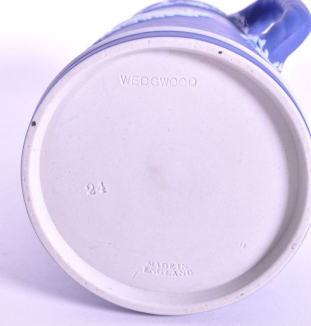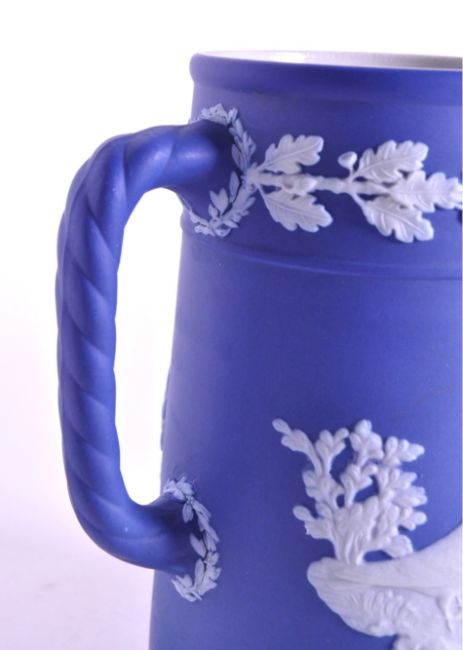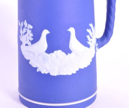 1930s Wedgwood dark blue Jasperware jug for Bristol based company which manufactured bird seed called Capern's. Decorated with relief white dove birds and oak leaf motifs. Stamped Wedgwood Made in England and numbered 24. Measuring approx. 15.5cm x 12cm.