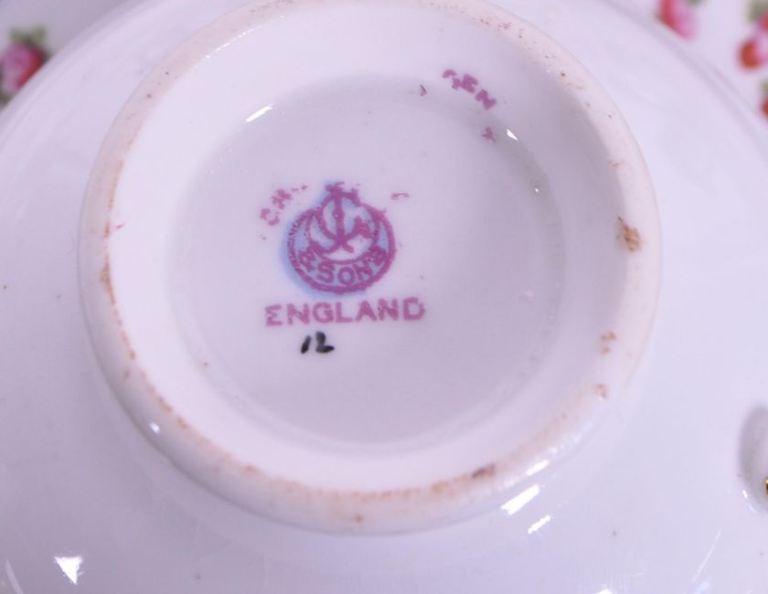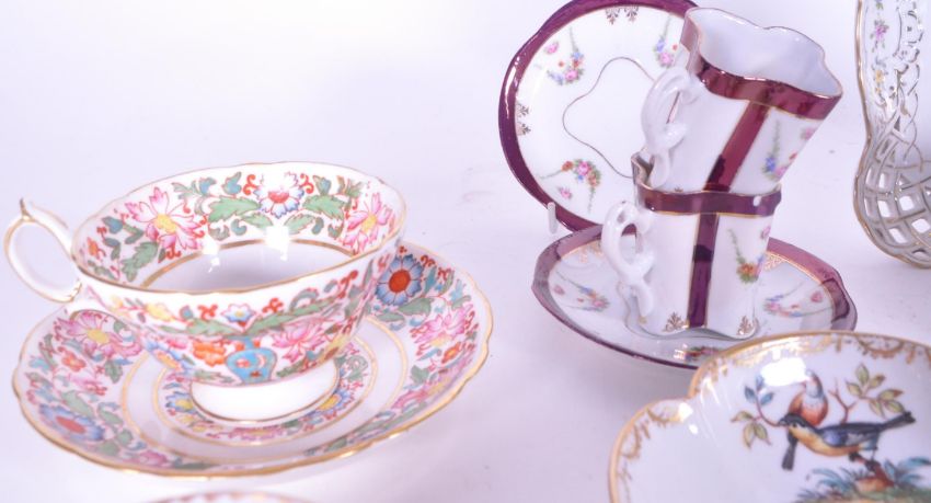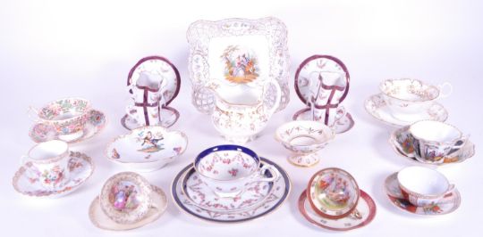 A collection of early 20th century & later china porcelain tableware items. Including Royal Vienna, George Jones, Dresen, Hammersley, Crescent (trios), side plates, milk jug, and pierced serving cake plate. Some with maker's mark to underside.
