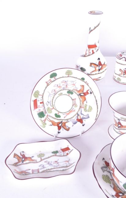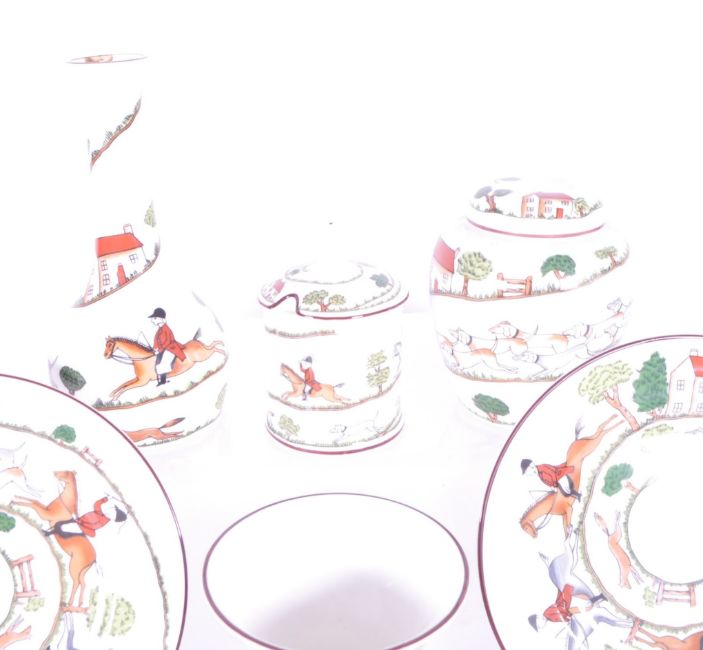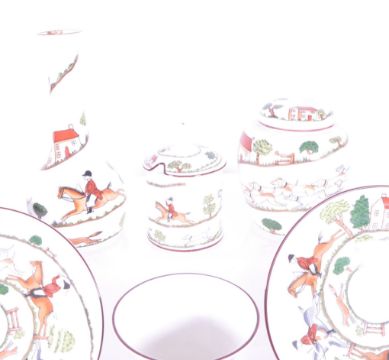 Coalport - A collection of vintage 20th century Coalport Hunting Scene fine bone china pieces. The collection to include a small ginger jar, bud vase, bowl, lidded pot and other examples. Each having white ground, decorated with polychrome hunting scenes.