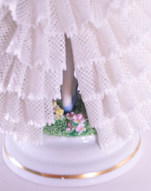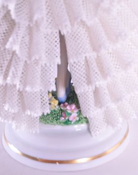 Sitzendorfer Porzellanmanufaktur - 20th century German porcelain lady figure. Featured in a layered lace dress. Raised on a circular gilt detailed base, with makers mark to the underside. Housed within the original box. Measuring approx. 18.5cm tall (without box).