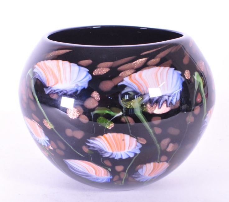 Late 20th century Romanian studio glass bowl in a black colourway and decorated with red and blue flowers, green vines, and copper coloured speckles within the glass exterior. Unmarked. Measuring approx. 17cm x 21cm.