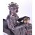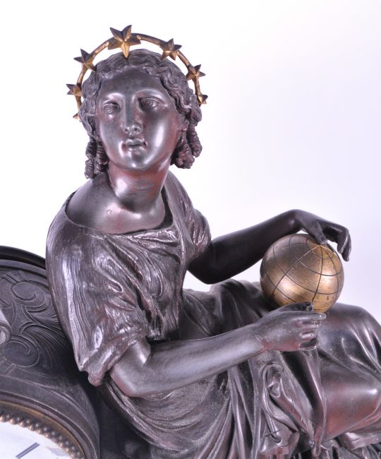 A 19th century French mantel clock, surmounted by a bronze effect seated woman holding a gilt painted globe on a chaise, French drum / barrel eight day movement with white enamel dial Roman numeral chapter ring on paw feet. All raised on a slate plinth base.